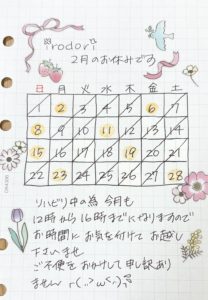 assignment CATEGORY news 2026 年2月のお休みについて 2026.01.28 2月のお休みは次のとおりです。2月1日2月3~5日2月7日 2月9日2月10日 2月12~14日 2月16~18日 2月20~22日 2月24~27日※リハビリ中の為、今月も12時から16時までになりますのでお時間にお気を付けてお越しくださいませ。ご不便をおかけして申し訳ありません。